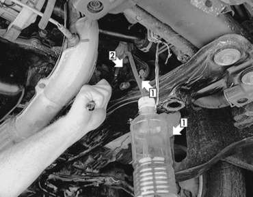 of fresh brake fluid (1), to the bleeder valve (2) on the slave cylinder