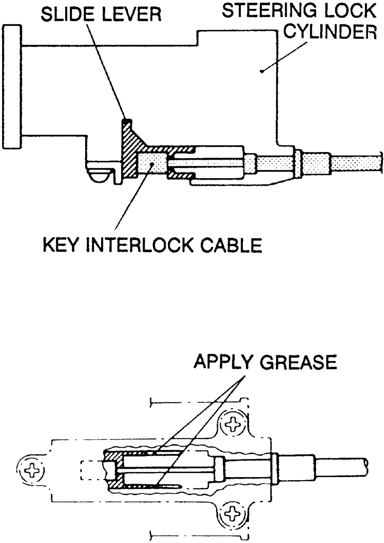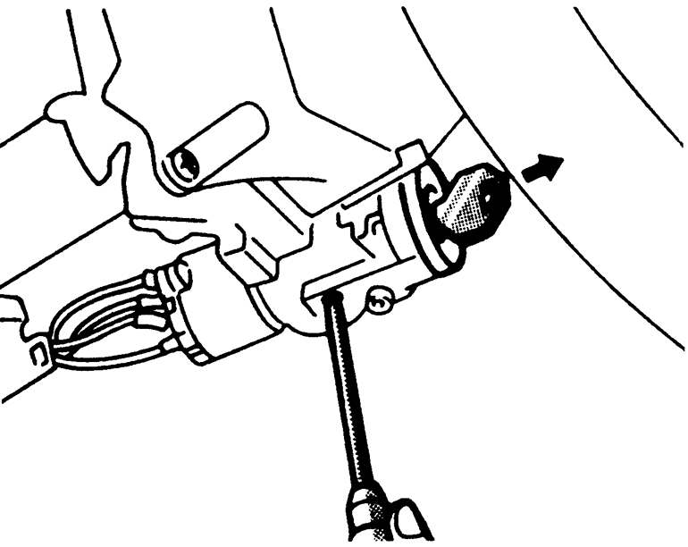 NOTE: When equipped with automatic transaxle, the vehicles have safety-lock systems and will have a key interlock cable installed in a slide lever on the side of the key cylinder. Carefully unhook the interlock cable from the lock cylinder while withdrawing cylinder from lock housing.