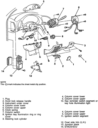 | Fig. 2: Exploded view of the ignition switch and related components — 1990–94 vehicles |