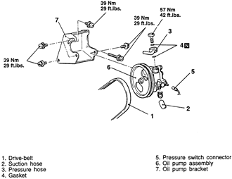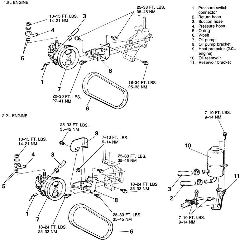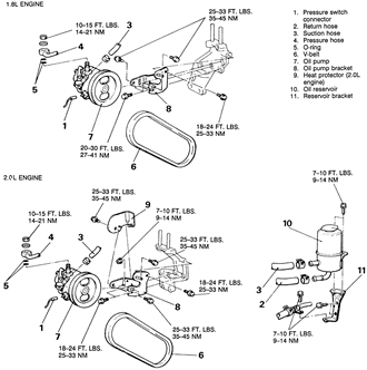 | Fig. 2: Exploded view of the power steering pump and related components — 1995–98 2.0L non-turbo engines |