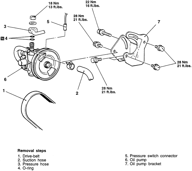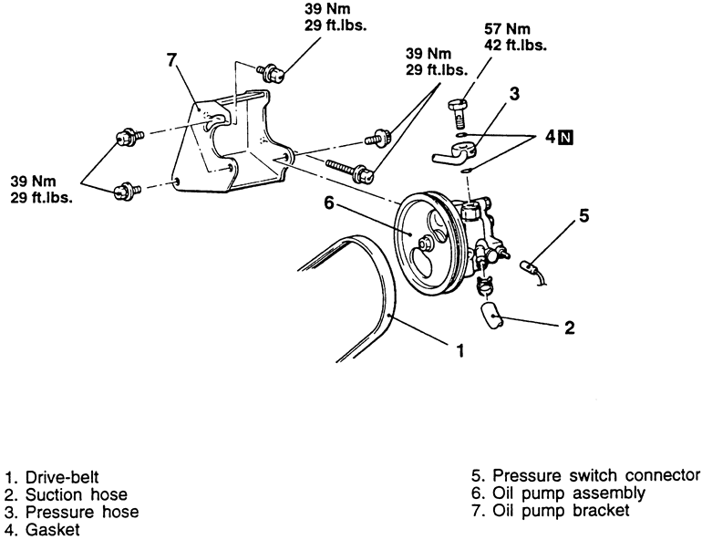 | Fig. 1: Exploded view of the power steering pump mounting–1990–94 vehicles |