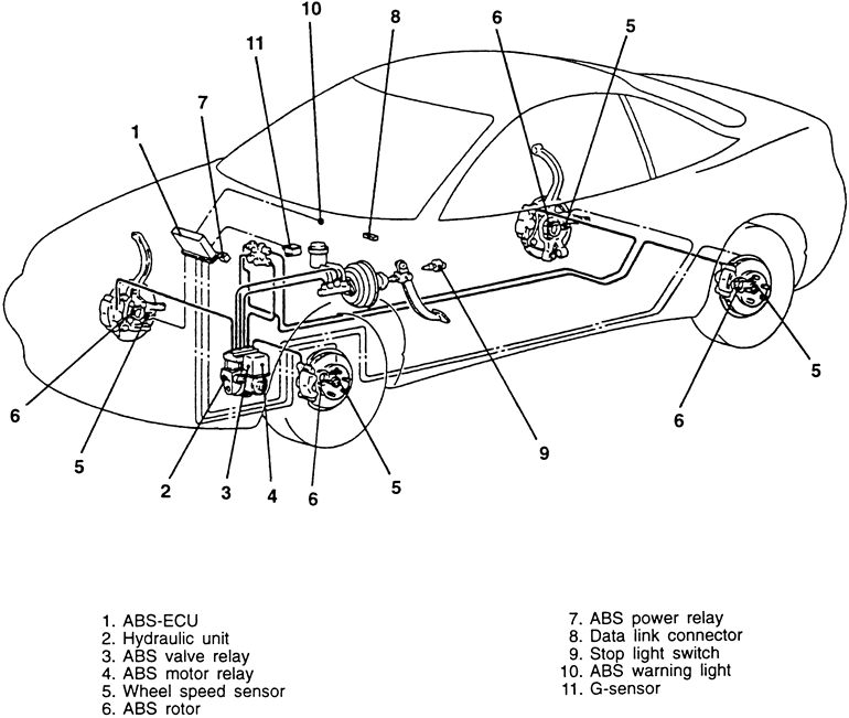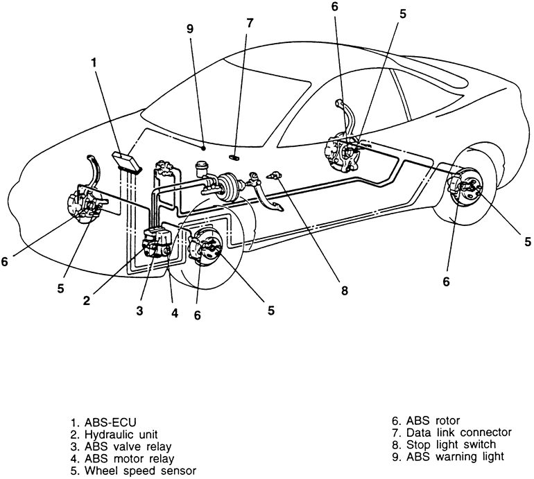 | Fig. 2: Location of the ABS system components — 1997 AWD vehicle shown, others similar |