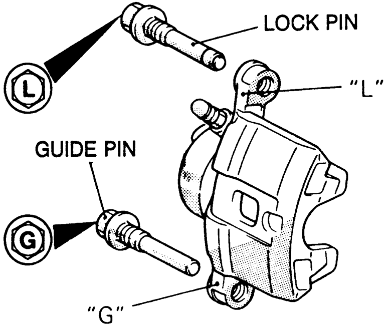 | Fig. 10: If equipped, install the guide and lock pins so the identification mark on the caliper body and head mark on the pins are aligned |
