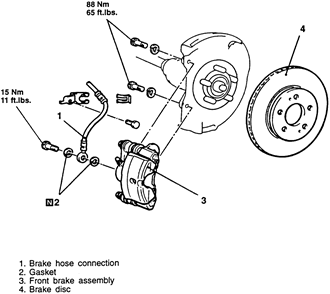 Fig. 1: Exploded view of the front disc brake components — 1995–98 vehicles shown