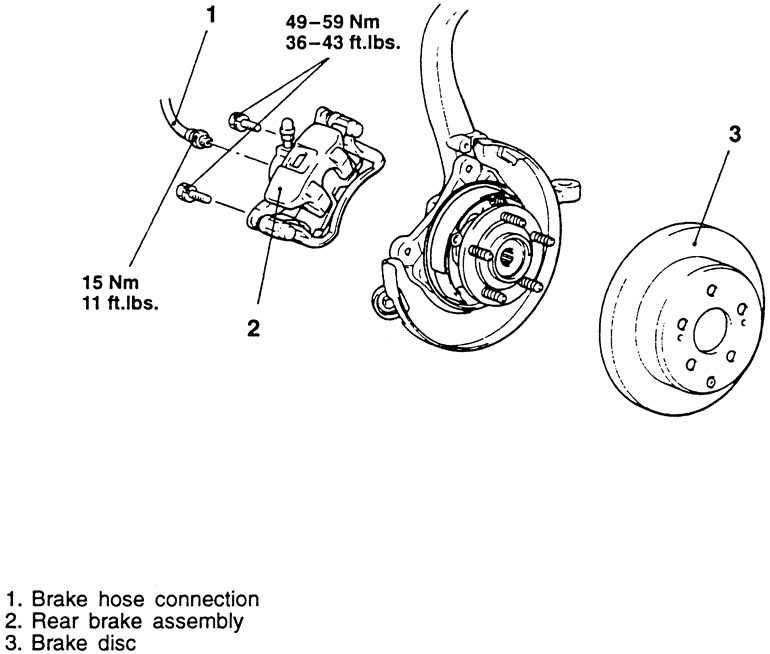 Fig. 2: Exploded view of the rear disc brake components — 1995–98 vehicles shown