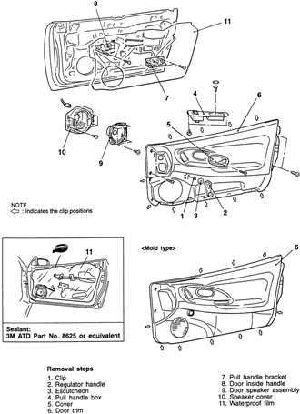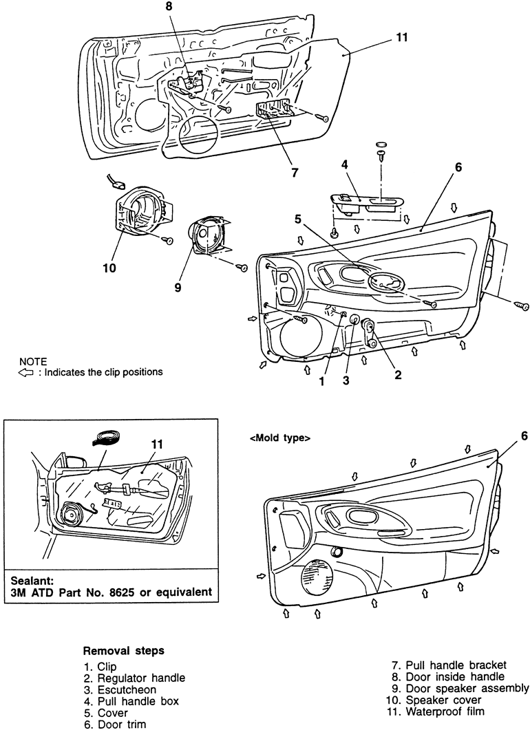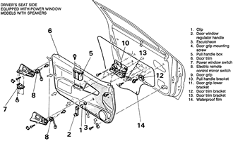 | Fig. 1: Exploded view of the door trim panel and related components — 1990–94 driver's side shown |