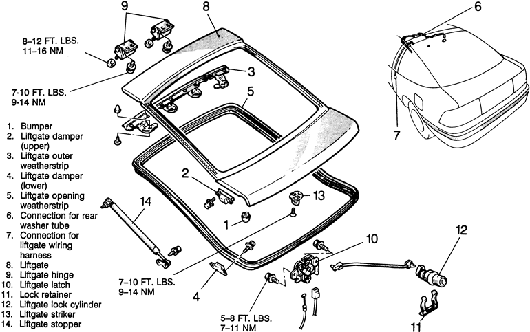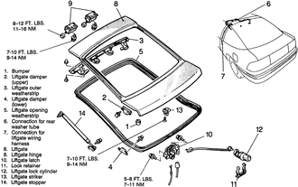| Fig. 2: Exploded view of the rear liftgate assembly — 1995–98 vehicles |
