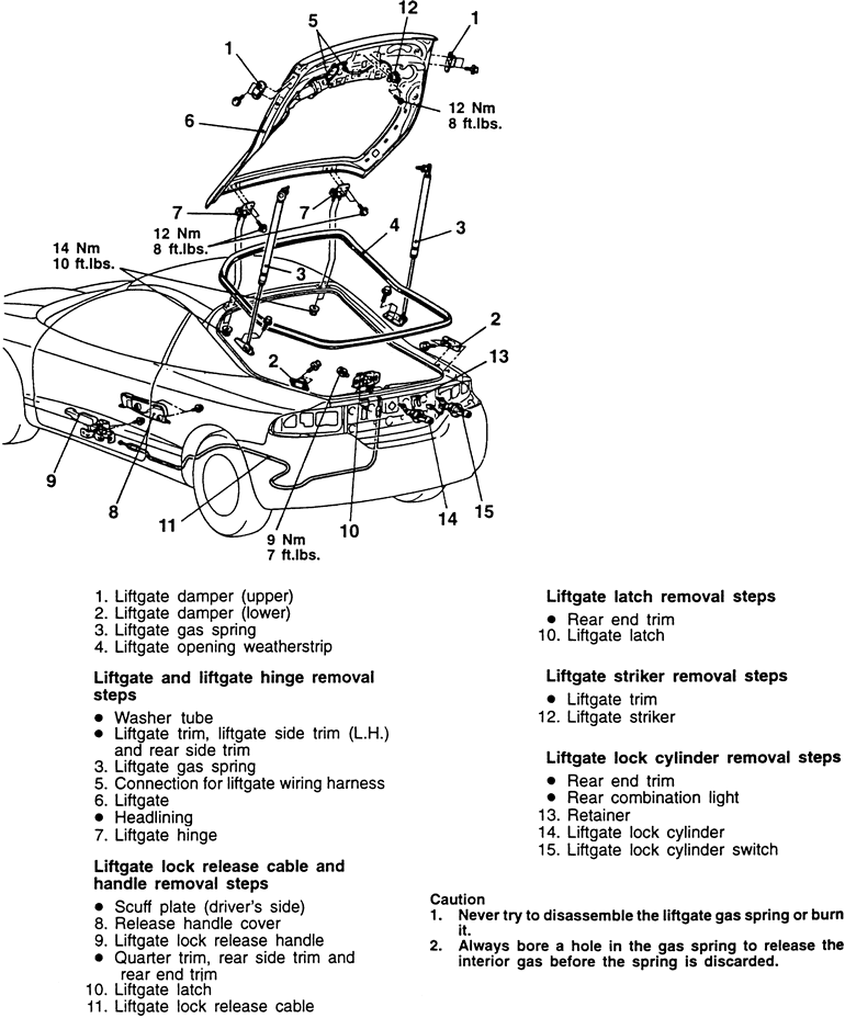 | Fig. 1: Liftgate and related components as seen on a 1993 Laser/Talon — 1990–94 vehicles similar |