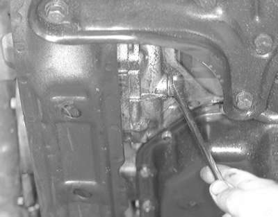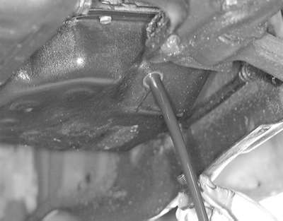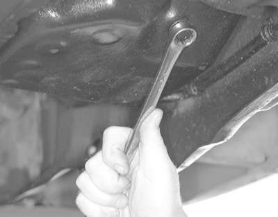 bottom of the fluid pan. Typically the drain plug requires a 17mm wrench