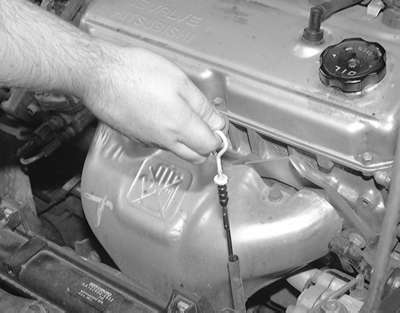| Fig. 1: Grasp the oil level dipstick and pull upward