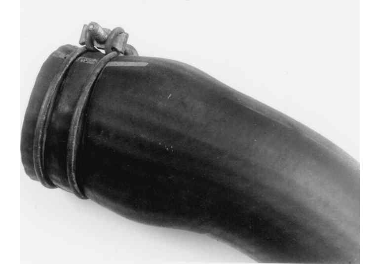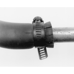 | Fig. 2: A hose clamp that is too tight can cause older hoses to separate and tear on either side of the clamp |