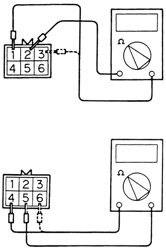 If the driver and circuits test OK, detach the connector from IAC motor. Using an ohmmeter, probe the connector on the IAC motor, NOT THE WIRING HARNESS> between pins 2 and 1, and pins 2 and 3. Resistance should measure between 28–33 ohms. If the resistance values are different replace the IAC motor. If the tests between pins 1, 2, and 3 are within specification, check the resistance between pins 5 and 4, and pins 5 and 6. Resistance should measure between 28–33 ohms. If the resistance values are different replace the IAC motor.