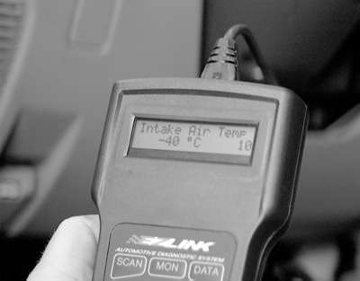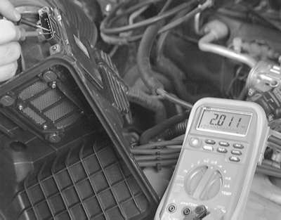 | Fig. 6: Measure the intake air temperature sensor resistance while heating it with a hair drier |