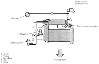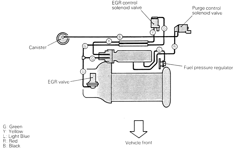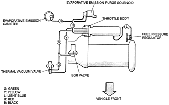 | Emission control system vacuum hose routing — 1990–92 1.5L engine, California emissions |