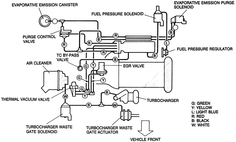 | Emission control system vacuum hose routing — 1991–93 2.0L DOHC turbo engine, Federal |