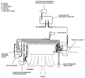 | Emission control system vacuum hose routing — 1991–93 2.0L DOHC non-turbo engine, California |