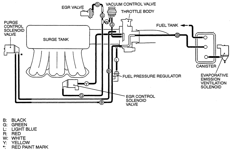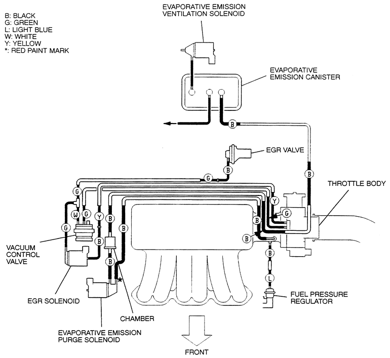 | Emission control system vacuum hose routing — 1993 1.5L engine, California emissions |