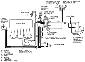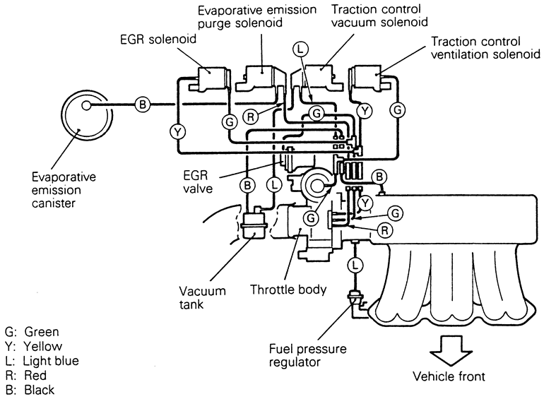 | Emission control system vacuum hose routing — 1992 3.0L engines (SOHC and DOHC) w/traction control, California emissions |