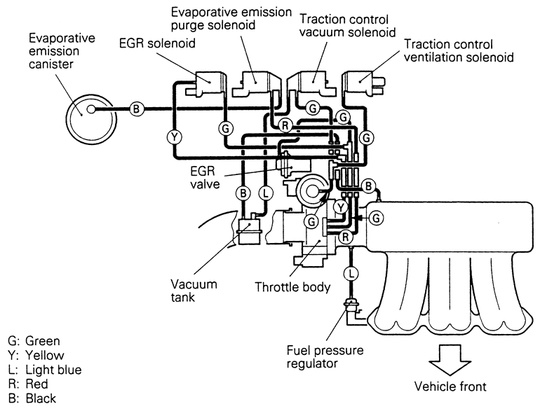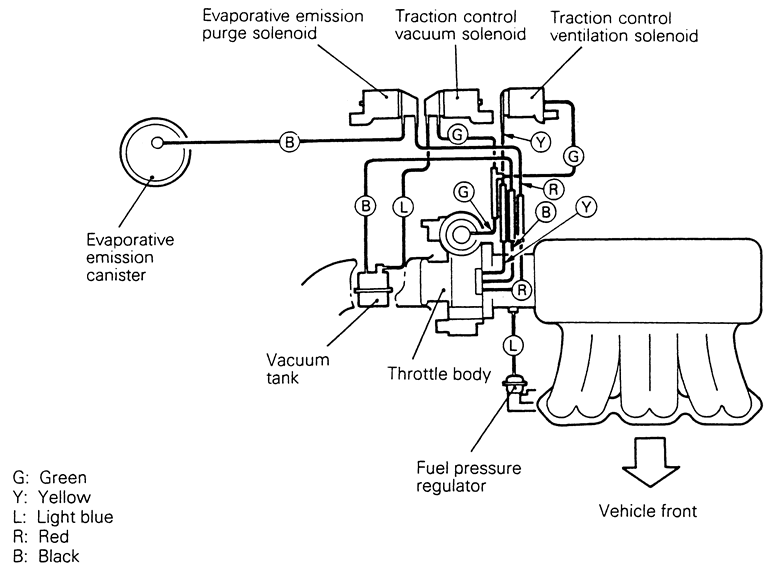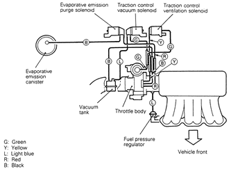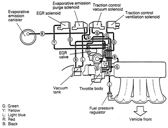 | Emission control system vacuum hose routing — 1993–96 3.0L engines (SOHC and DOHC) w/traction control, California emissions |