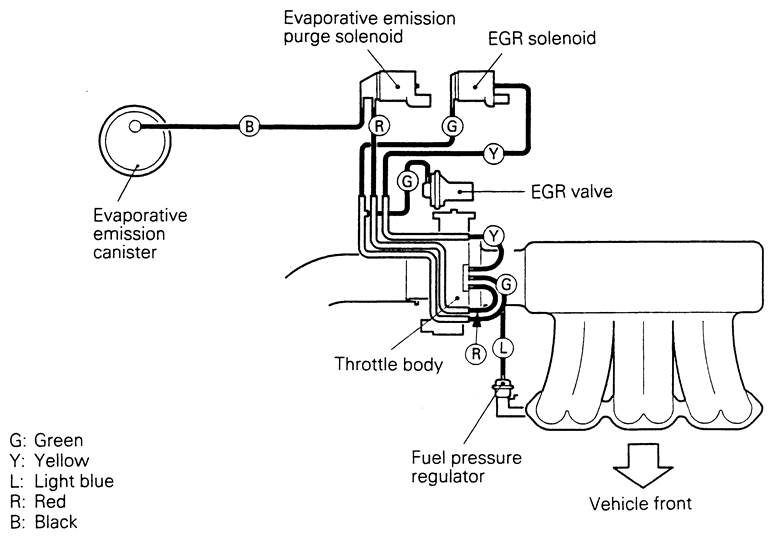 | Emission control system vacuum hose routing — 1990–93 2.0L SOHC engine, California emissions |