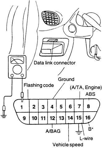 | Fig. 1: For OBD II code retrieval without using a scan tool on Mitsubishi models, connect the DVOM and jumper wire as shown |