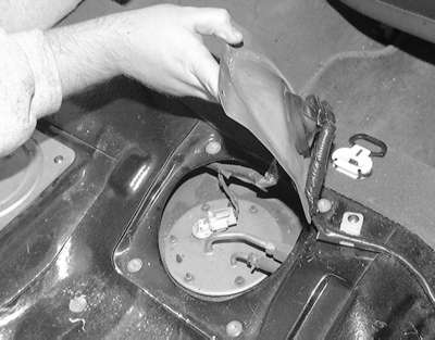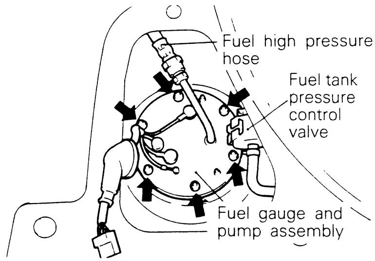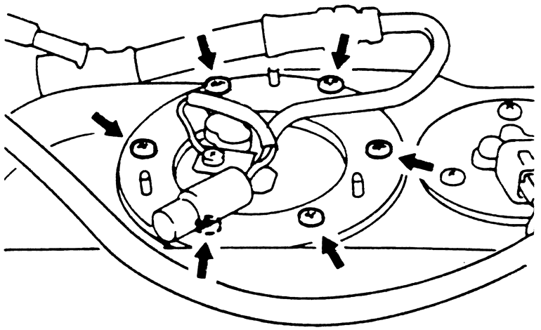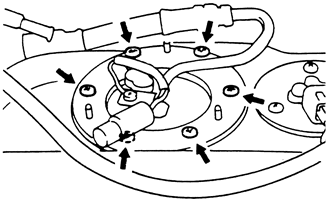 | Fig. 5: Remove the six pump retaining bolts and remove the fuel pump and gauge assembly from the tank — 1990–93 AWD Galant |