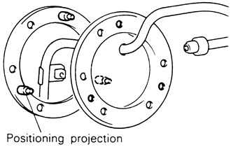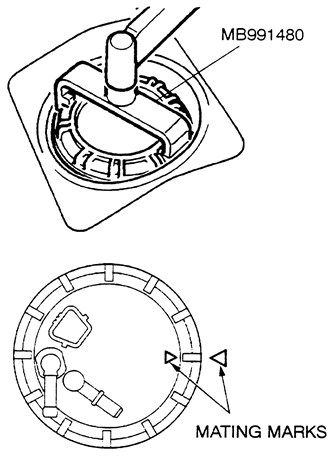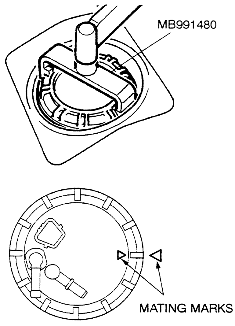 | Fig. 17: Install the fuel pump assembly to the tank and align the mating marks on the pump and the floorpan — 1999–00 Galant |
