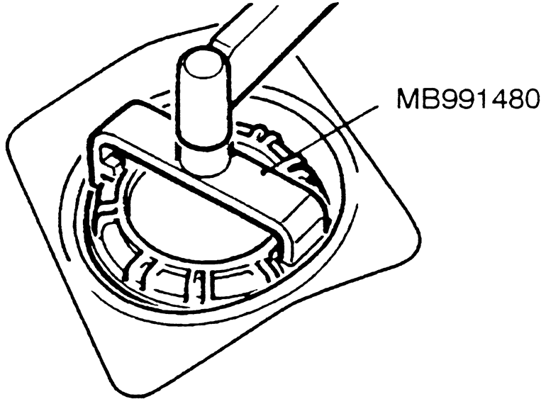 | Fig. 15: Using special tool MB991480 or equivalent, remove the fuel pump retaining cap and remove the pump assembly — 1999–00 Galant |