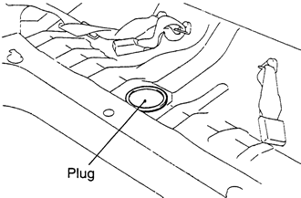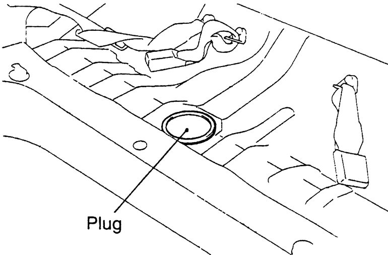 | Fig. 14: Install 3M ATD Part No. 8625 or equivalent, to the rear floor pan and install the access cover or plug into place |