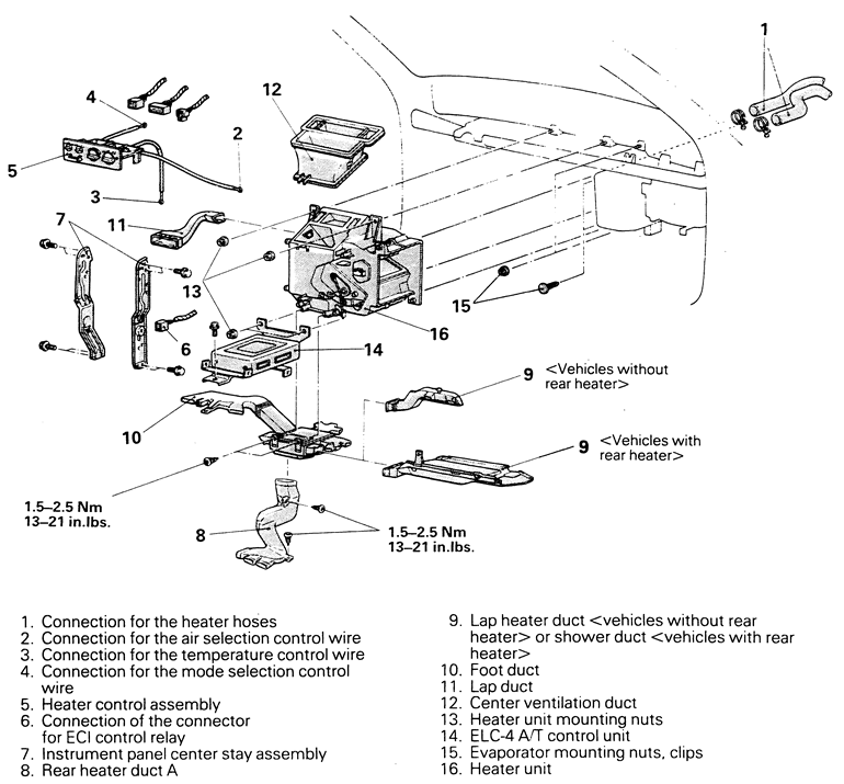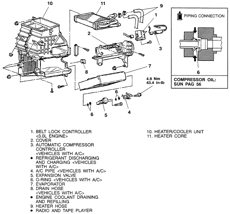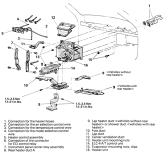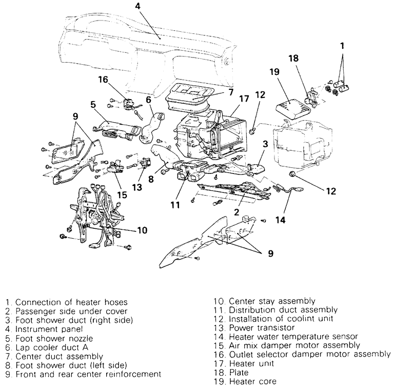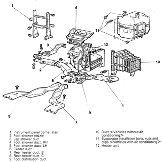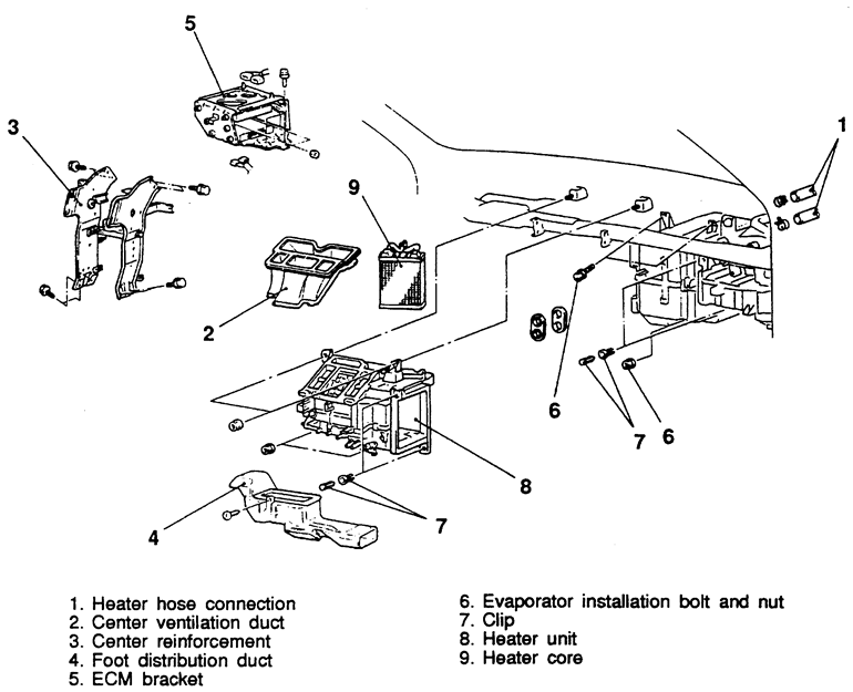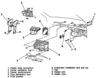 | Fig. 6: Exploded view of the heater core and related components — 1990–92 Mirage |