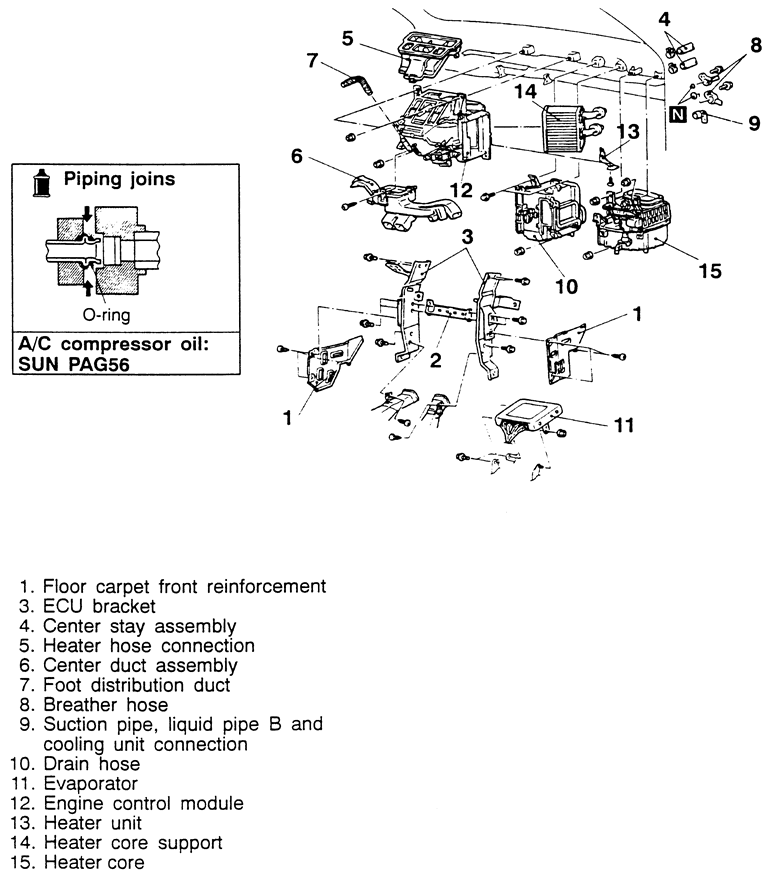 | Fig. 1: Heater core and related components exploded view — 1992–96 Diamante |