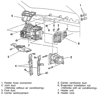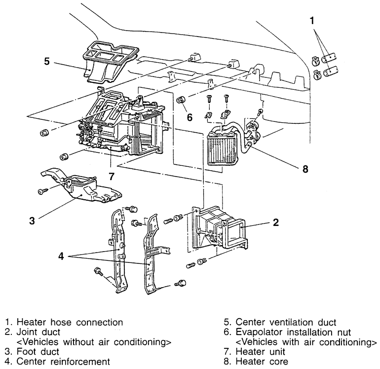 | Fig. 8: Exploded view of the heater core and related components — 1997–00 Mirage |