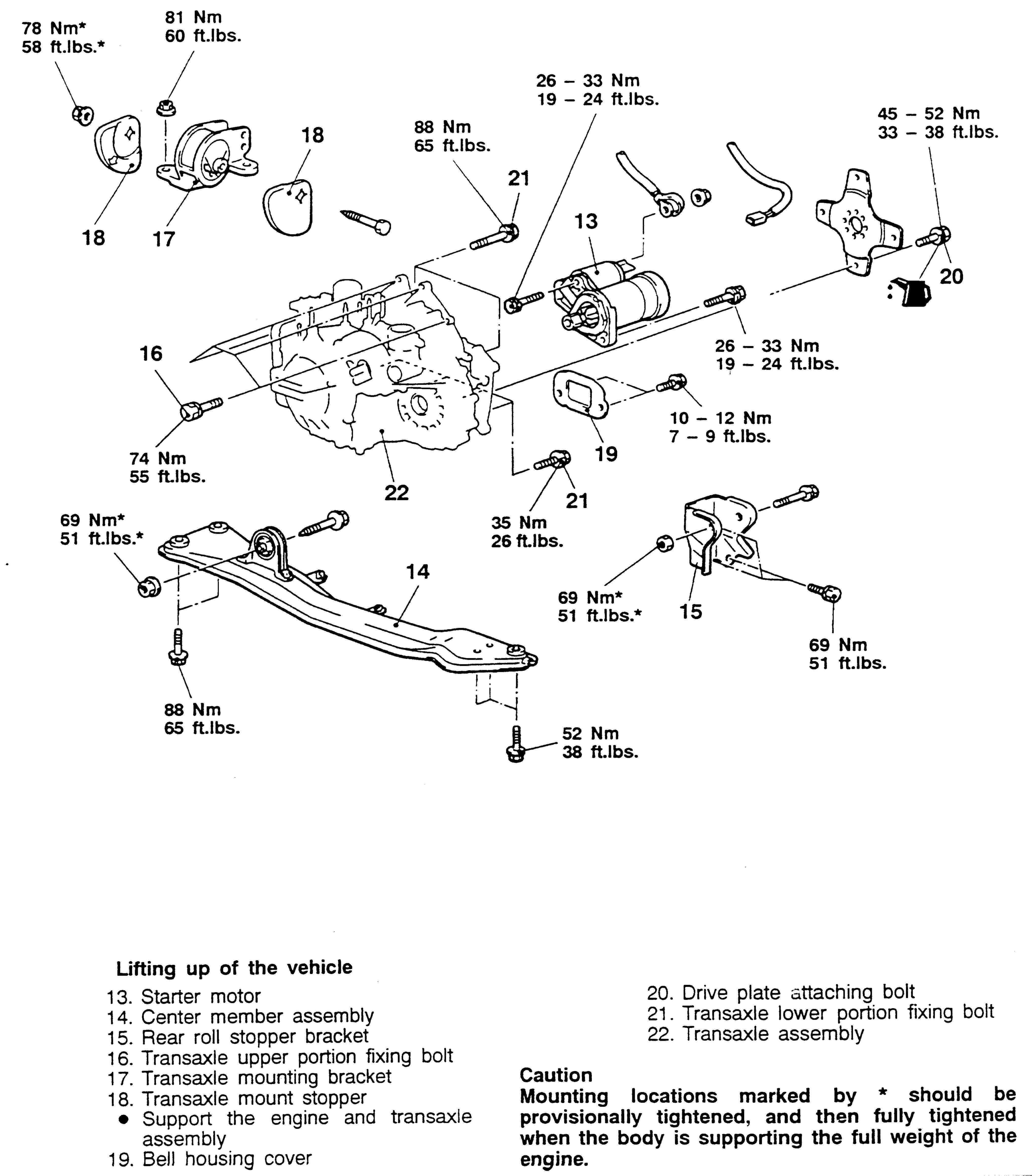 - Remove the engine support. Tighten the transaxle mount through-bolt to 51