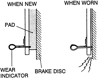The disc brake pads have wear indicators that contact the brake disc when the brake pad thickness becomes 0.08 in. (2.0mm) and emit a squealing sound to worn the driver.
