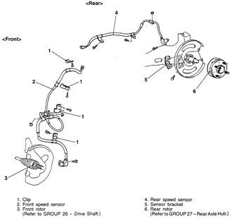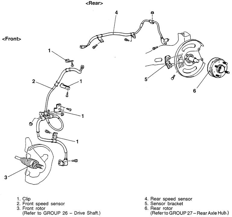 | Fig. 1: Front and rear wheel speed sensors — Mirage |