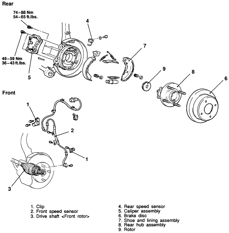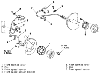 | Fig. 3: Wheel speed sensors — 1990–93 AWD Galant |