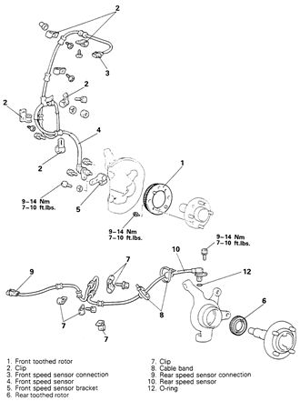 | Fig. 4: Wheel speed sensors — 1994–00 Galant |
