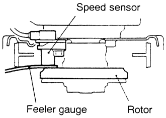 NOTE: The clearance between the wheel speed sensor and the rotor's toothed surface is not adjustable, but measure the distance between the sensor installation surface and the rotor's toothed surface. Standard value is: 1.11–1.12 in. (28.2–28.4mm). If not within specifications, replace the speed sensor or the toothed rotor.
