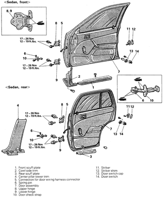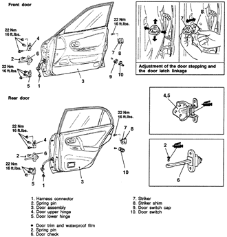 Fig. 2: Door mounting exploded view — 1994–98 Galant