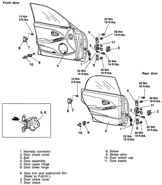 Fig. 3: Door mounting exploded view — 1997–00 Diamante