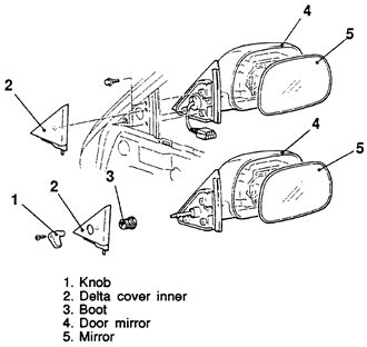 Fig. 1: Outside door mirror mounting — 1994–98 Galant shown, others similar