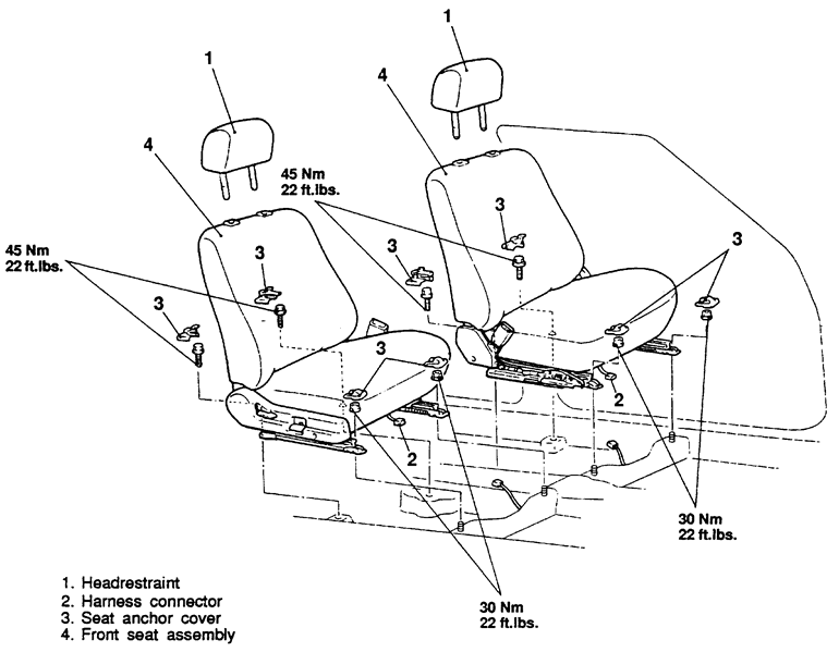 | Fig. 1: Front seat mounting — 1994–98 Galant shown, others similar |