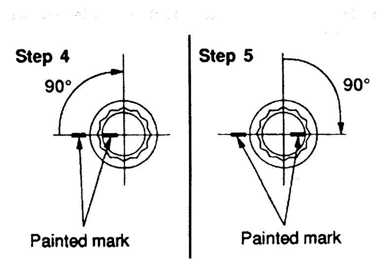 | Fig. 3: To ensure that the bolts are tightened exactly 180 total degrees, mark the head bolt and cylinder head as shown — 2.0L (4G63) engine |