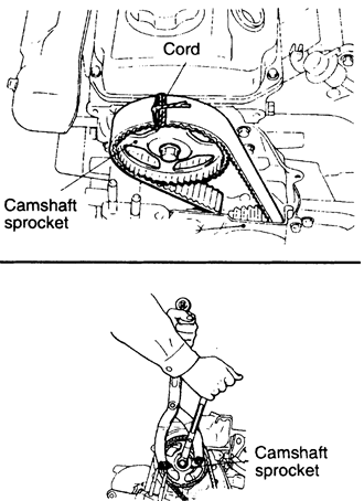 | Fig. 5: Secure the timing belt to the camshaft sprocket and remove the sprocket — 2.4L (4G64) engine |