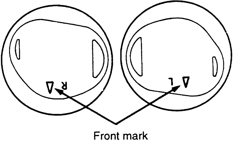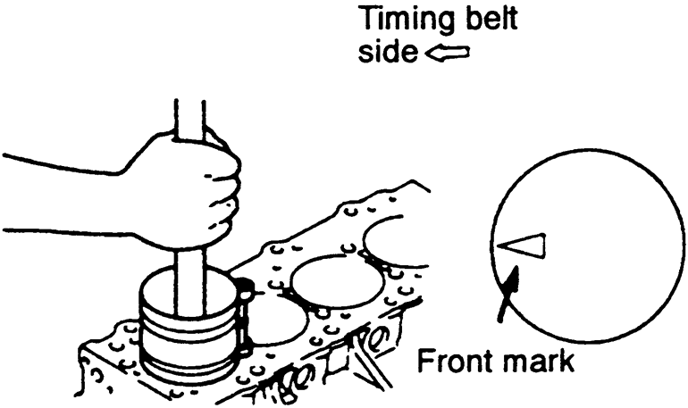 | Fig. 7: 1.5L, 1.8L. 2.0L and 2.4L engines — piston-to-engine block mark location on the piston face |