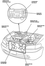 Fig. 1: Typical dual fan set-up, showing common cooling fan system control components used on many vehicles with A/C
