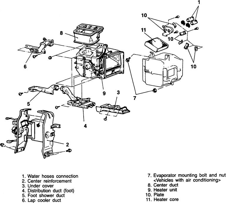 | Fig. 2: Exploded view of the heater case and related components — Mitsubishi 3000GT |