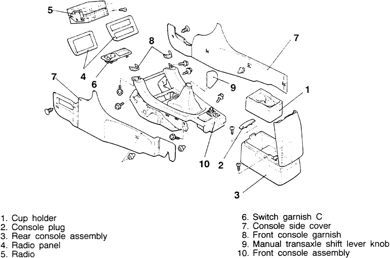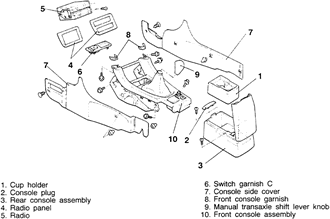 | Fig. 3: Exploded view of the floor console and related components — Mitsubishi 3000GT |