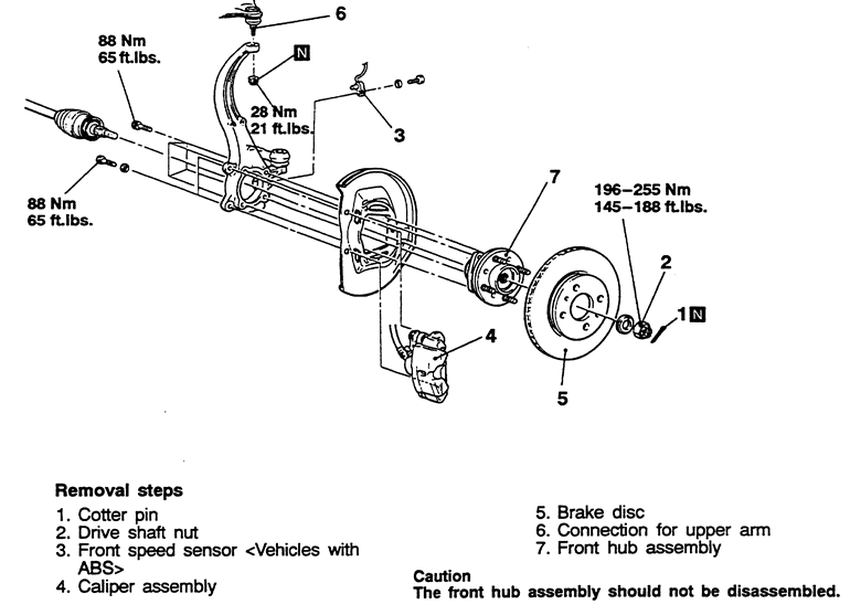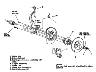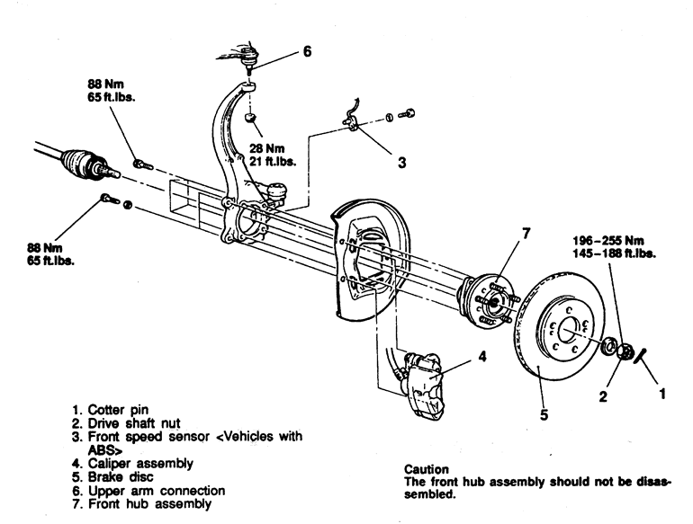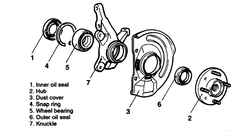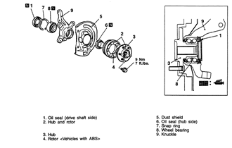 | Fig. 1: Exploded view of the front hub and bearing — 3000GT
