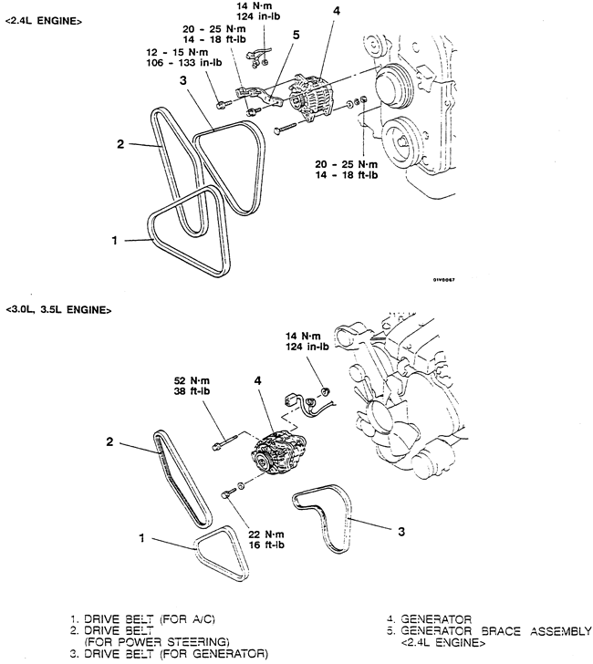 Alternator. On the 2.4L torque the through-bolt to 14–18 ft. lbs.